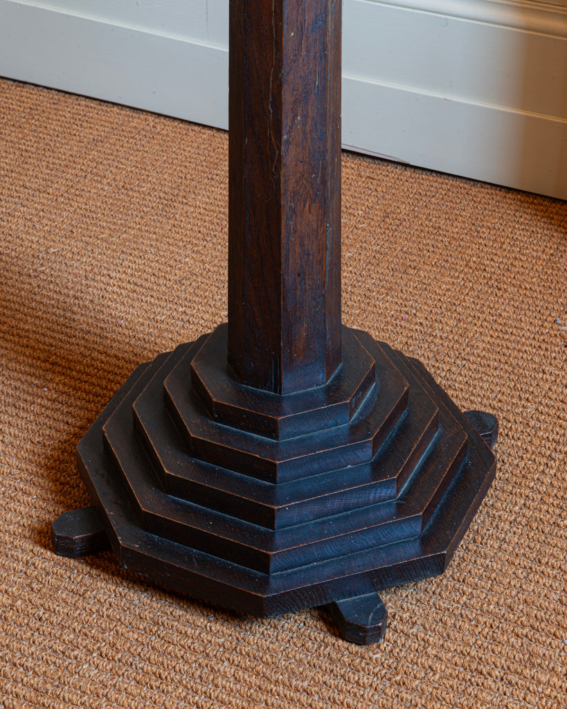 A striking Art Deco pedestal table named for its ziggurat-style base, with bold geometric layers evoking the grandeur of ancient Mesopotamian architecture. Crafted in a dark wood finish, the central column rises clean and unadorned before meeting a square top, offering a sleek contrast to the stepped foundation. This sculptural piece captures the glamour and architectural daring of the 1920s, ideal as a statement side table or display stand in a modern or classic interior.