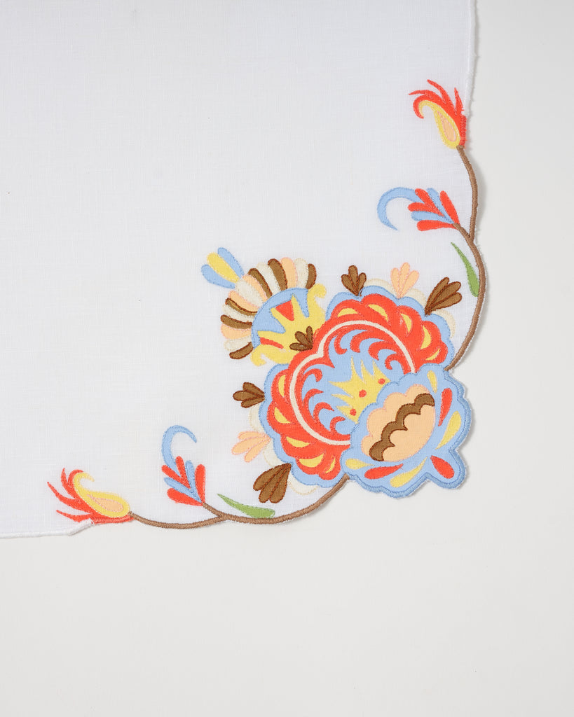 The Benaki Hand-Painted Linen Placemat is made from pure linen by the renowned Atelier Houria Tazi in Morocco. A traditional technique of alternating hand-painting with embroidery lends each piece a refined, artisanal charm that brings sophistication to any table setting. Each corner is embellished with a motif inspired by traditional Greek folk motifs, embodying the spirit of age-old Mediterranean craft and culture.