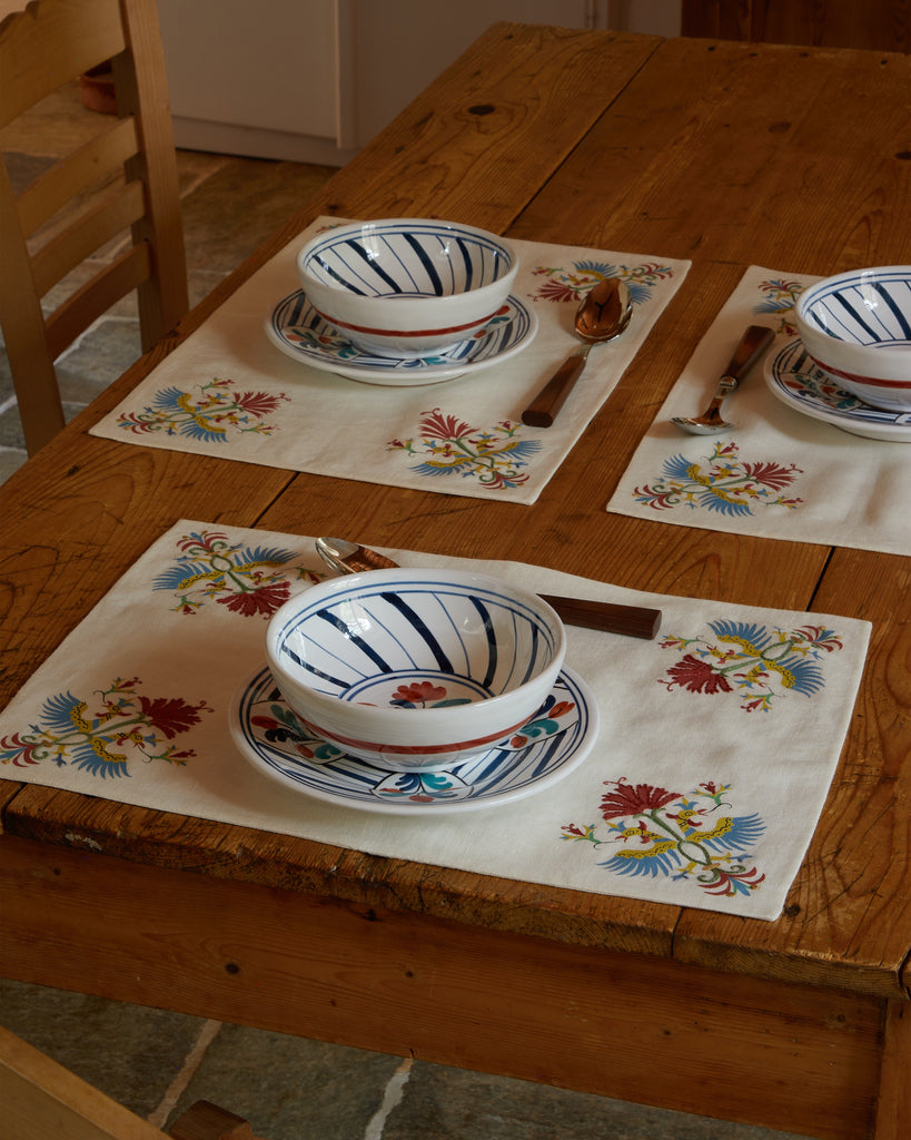 The Benaki Linen Placemat is printed with an ornate Greek folk pattern on 100% linen. Woven in the finest Egyptian linen, each placemat is embellished with embroidery detail. Hand-crafted by Malaika Linens, a women's cooperative artisan in Egypt, its exclusive design pays homage to traditional Greek folk motifs and embodies the spirit of age-old Mediterranean craft and culture.