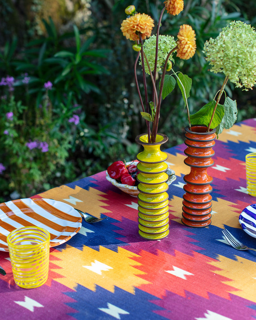 Experience the captivating collaboration between graphic designer Radl and renowned pottery brand Bitossi with the Revolver Collection, which showcases an interplay of engraved bands, featuring warm shades of yellow and bright orange alternating with subtle brown stripes in a matt tone. Inspired by ancient rituals and reminiscent of Mondrian paintings from the 1960s, this functional project includes vases, cups, and bowls that embody the perfect blend of aesthetic, graphic combinations, and authentic craftsmanship.