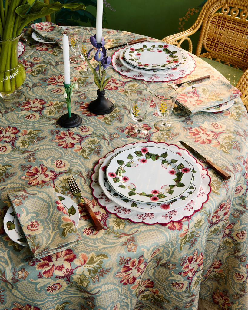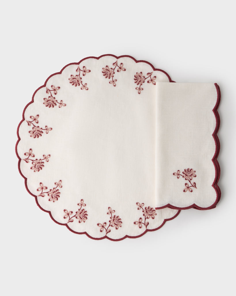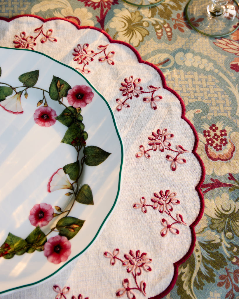 The Botanica Embroidered Round Placemat is crafted from soft linen, featuring a delicate floral embroidered border in a scalloped shape. This charming piece will bring effortless sophistication to your table.