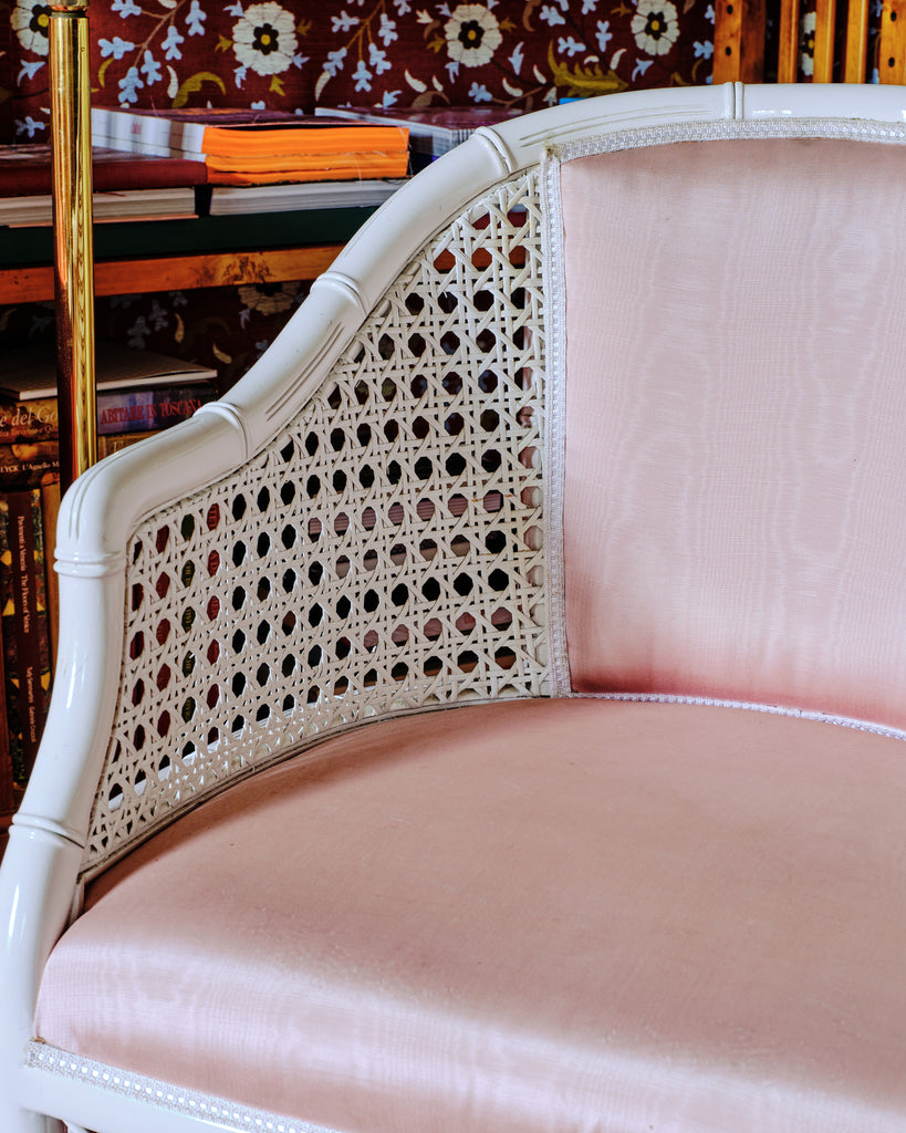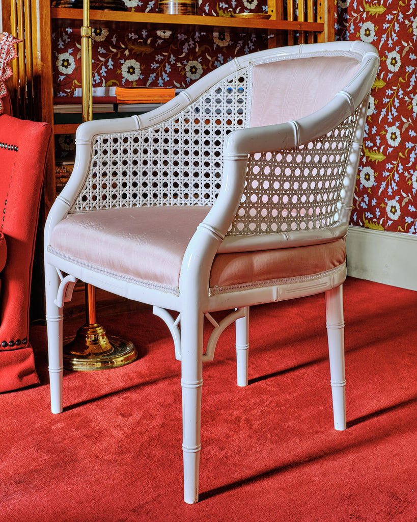 A charming occasional chair featuring a painted faux bamboo frame with caned back and pink velvet upholstered seat. The curved silhouette and pastel tones lend the piece a soft, romantic presence, making it a perfect accent for dressing rooms, bedrooms, or sitting areas with a light, feminine touch.