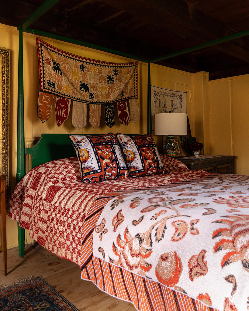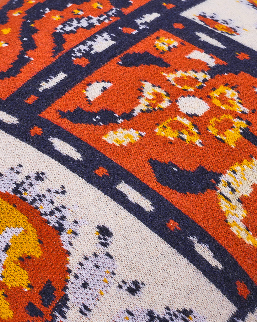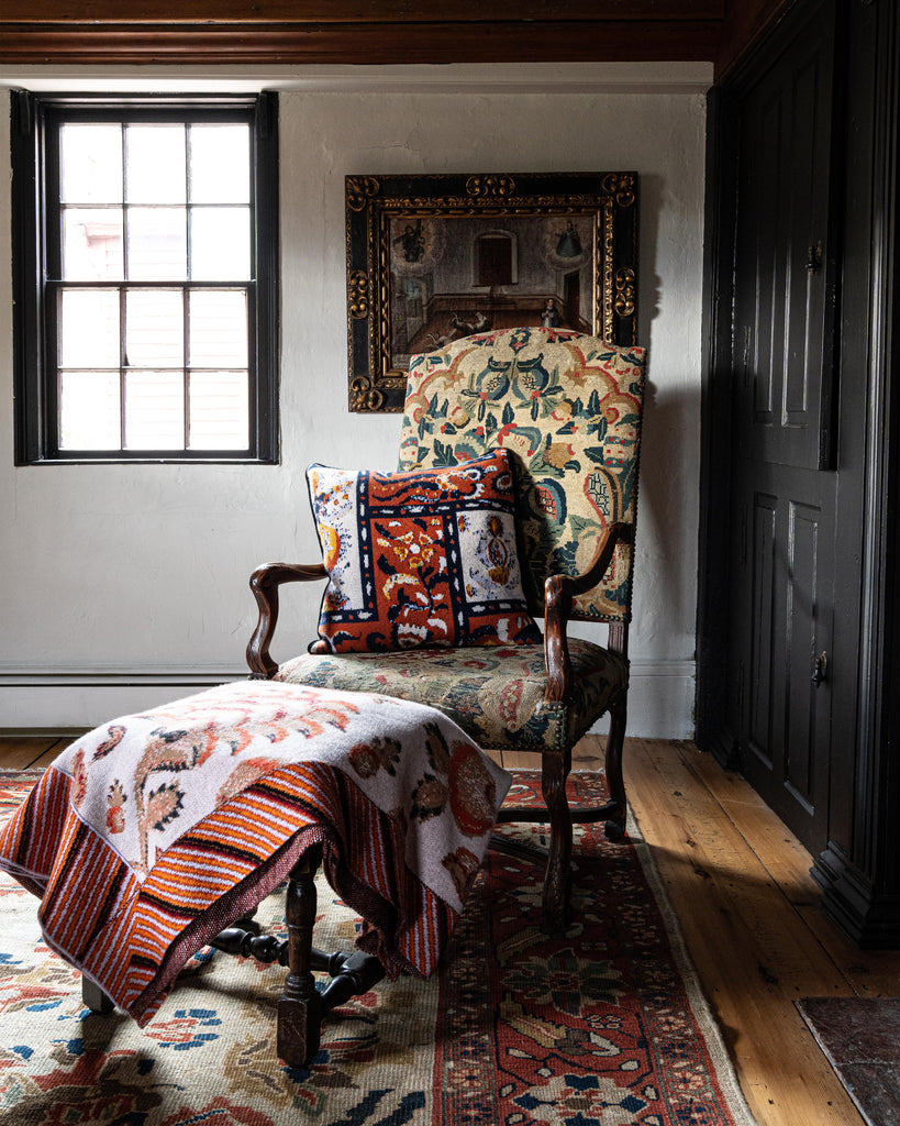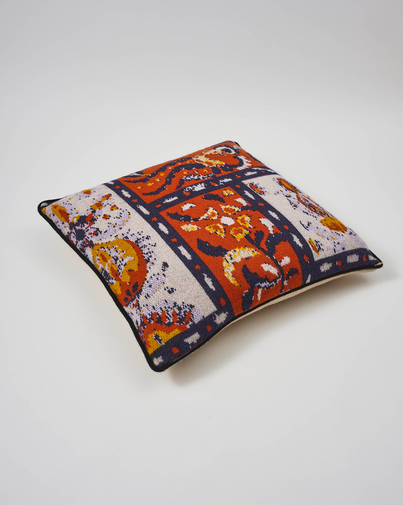 The Mongolian cashmere throw pillow is woven in luxuriously soft Mongolian cashmere and features a modern multi-colored weave. It is inspired by a collection of turn-of-the-century hand-blocked prints that Todd Nickey and Amy Kehoe unearthed during a trip in the South of France and boldly reimagined as a modern woven textile design.