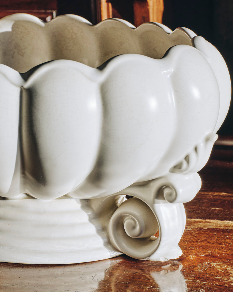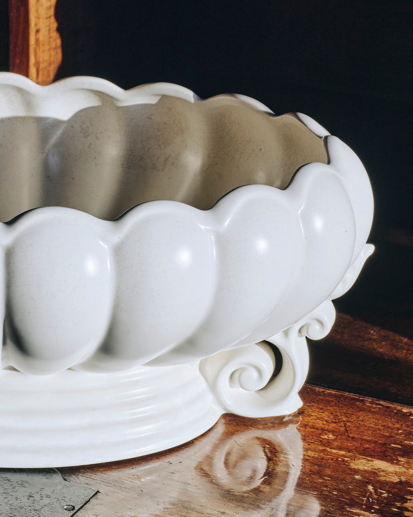 A generously scaled ceramic centerpiece bowl, sculpted with undulating scalloped sides and finished in a soft white glaze. The exaggerated curled handles evoke Baroque scrolls or stylised volutes, making this a striking statement for any tabletop. Equally compelling empty or overflowing with citrus, florals, or decorative objects.
