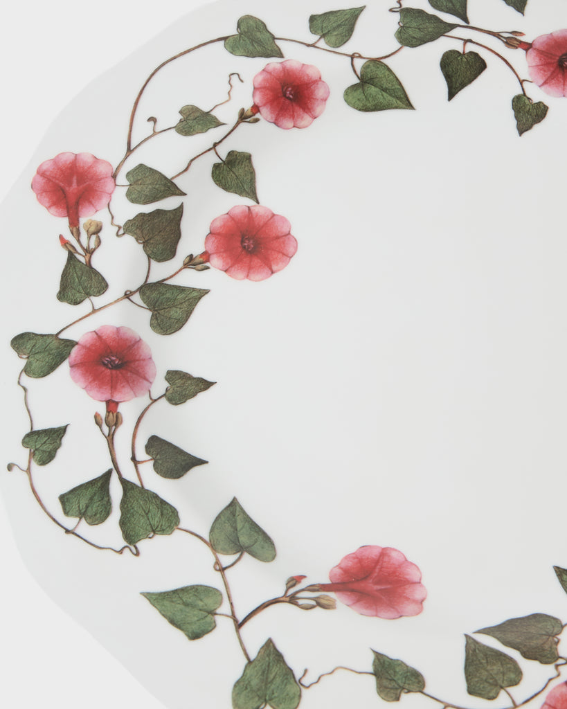 The Ciclamino Porcelain Charger Plate showcases a delicate wreath of pink cyclamen blossoms and lush green vines. Simple yet chic, these plates are perfect for both casual and formal dining settings.