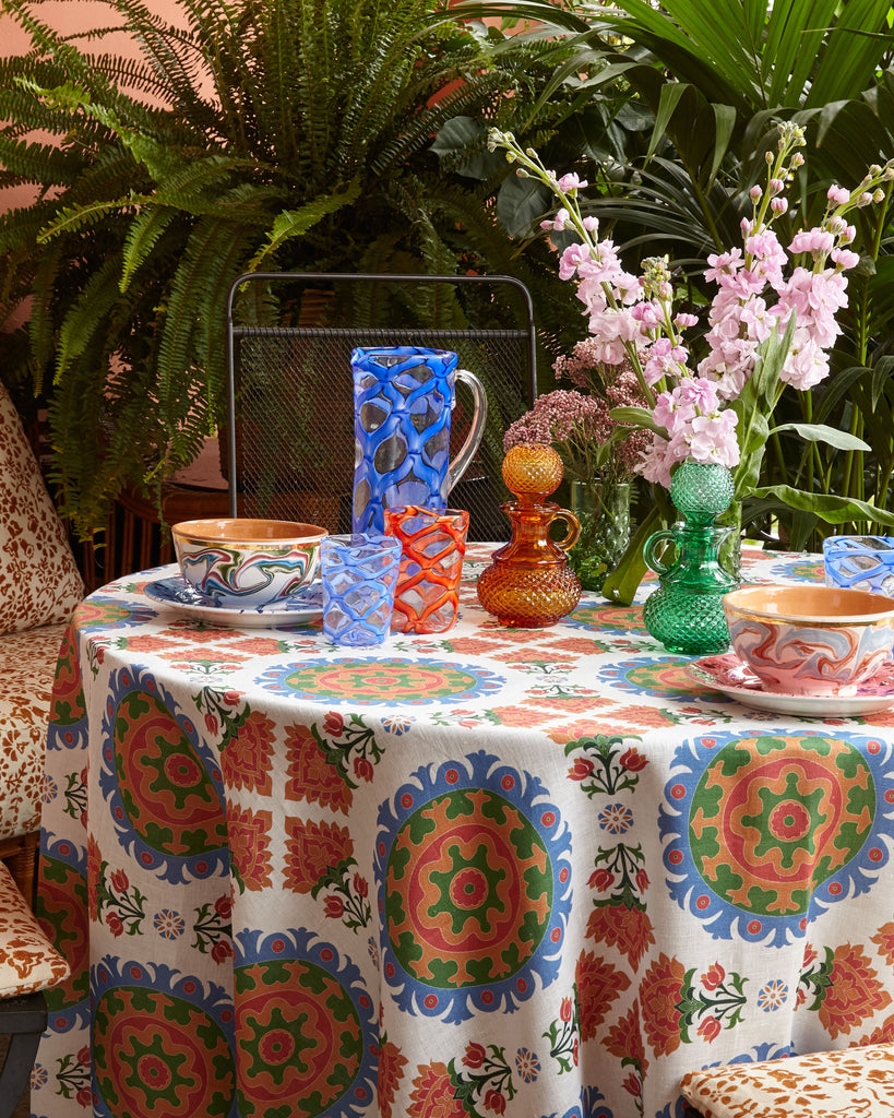 This handsome transparent and blue carafe decorated with rhombus patterns - produced in collaboration with Laguna~B - is hand-blown on the island of Murano, the historic site of Venetian master glass-working. A stand-out reflection of the mixture of design inspirations that we at Cabana hold dear, the carafe is a wonderful addition to any collection of tableware.