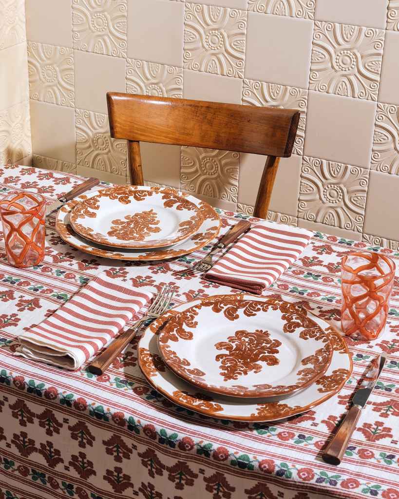 An elegant reference to the luxurious wares provided to the historic rulers of Venice, the Doge Water Glass - produced in collaboration with Laguna~B - is made on the legendary island of Murano, where glassblowers have been perfecting their art for centuries. Finished with a playful orange crisscross motif, their subtle exuberance is a perfect match for our “Rinascimento” textiles.