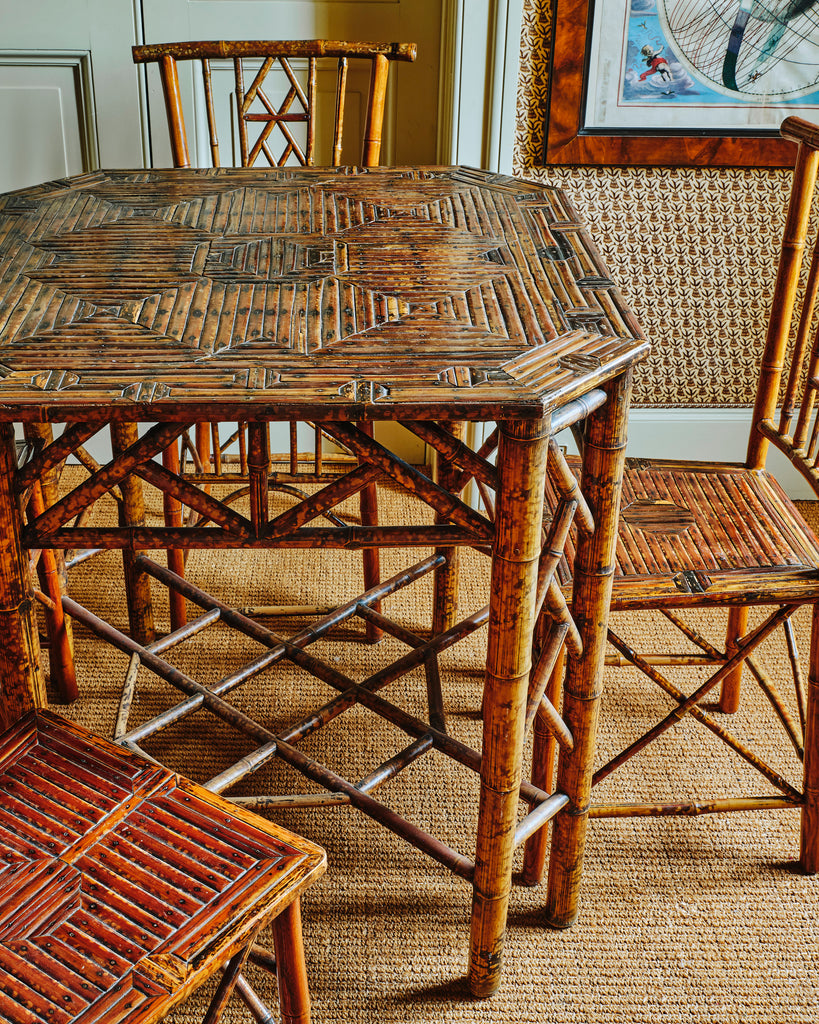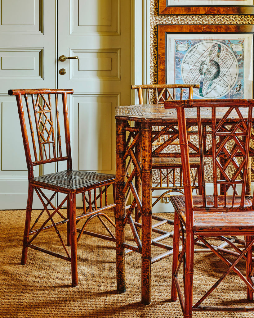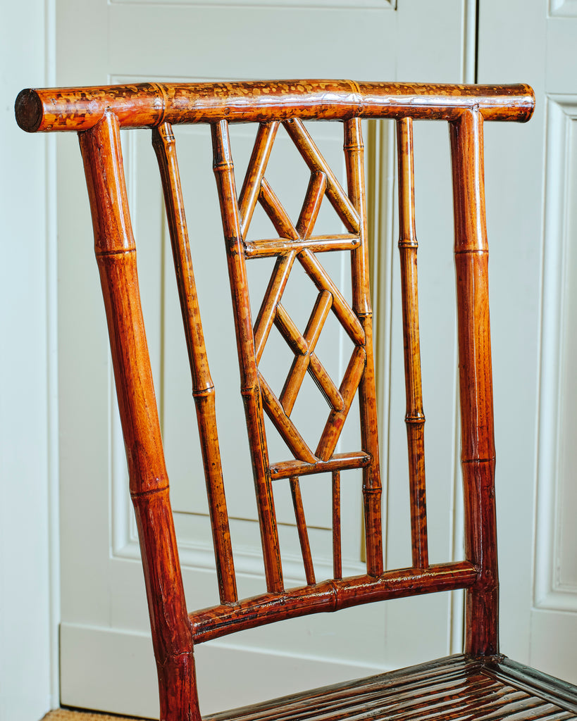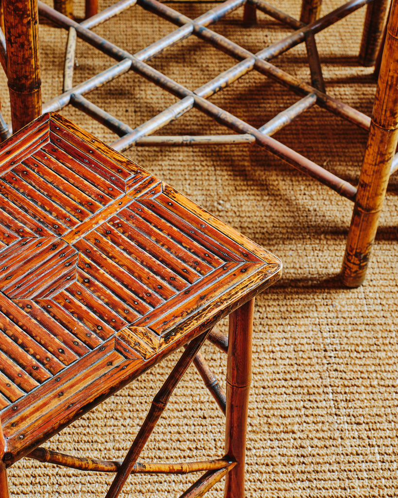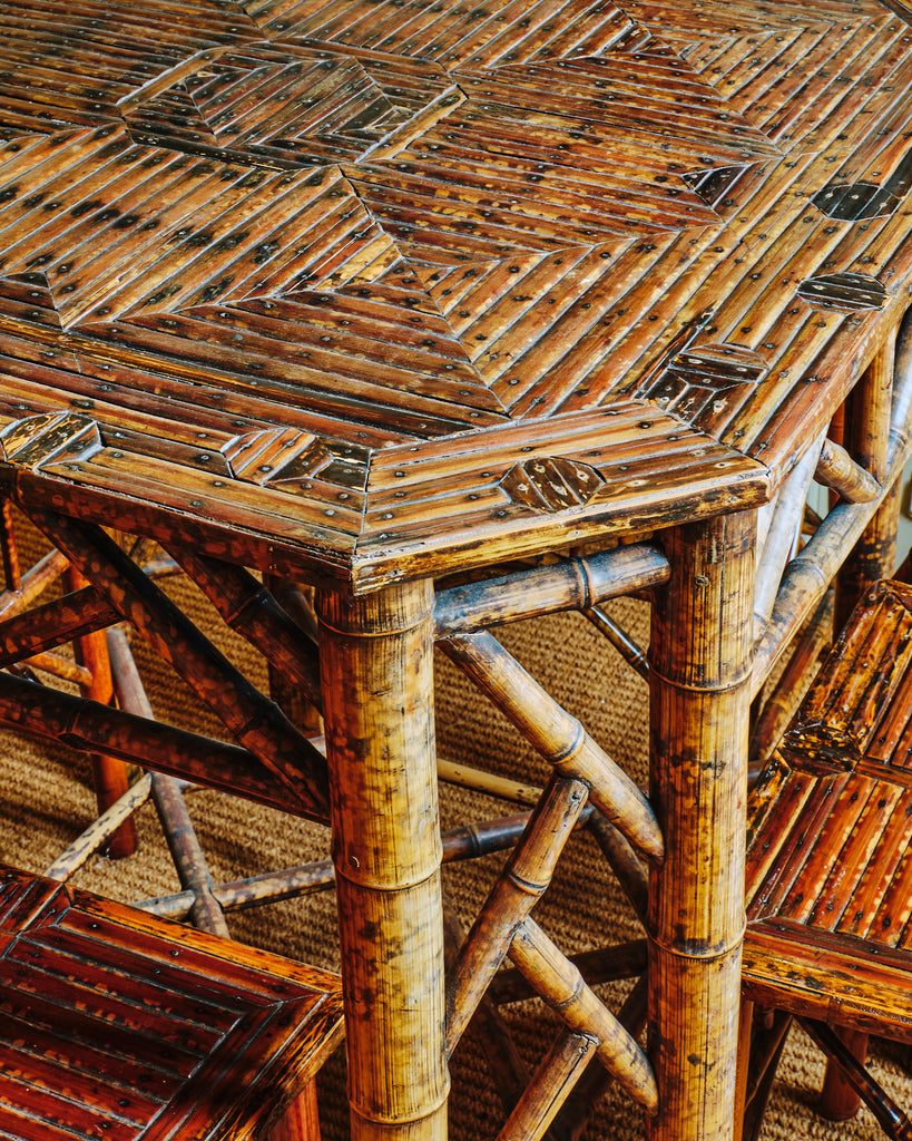 A dining suite comprising a rectangular bamboo table and four matching chairs, all finished in a warm faux tortoiseshell lacquer. The chairs feature caned seats and decorative spindles, echoing Anglo-Oriental design influences. A charming and practical set that lends casual elegance to verandas, conservatories, or garden rooms.