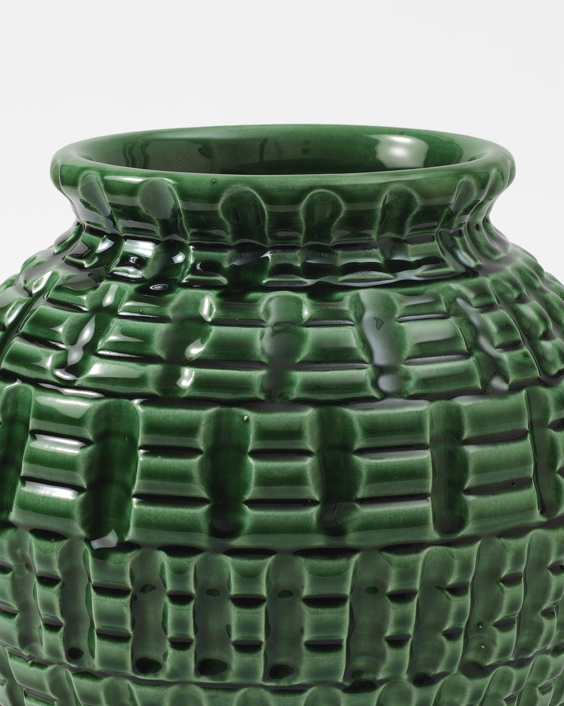 These exquisite, Chinoiserie-inspired vases are hand-crafted in Italy. They feature a raised geometric pattern, adding a distinctive touch to their ceramic structure. With a glazed finish in deep green, each piece radiates sophistication, making it a refined addition to any setting and elevating the overall aesthetic.