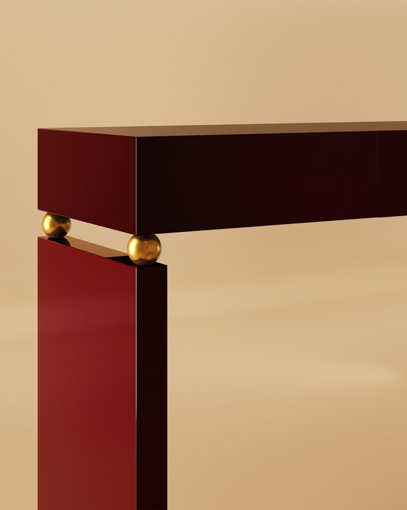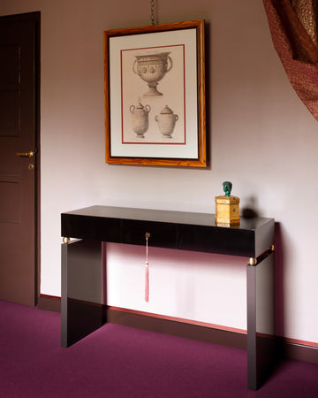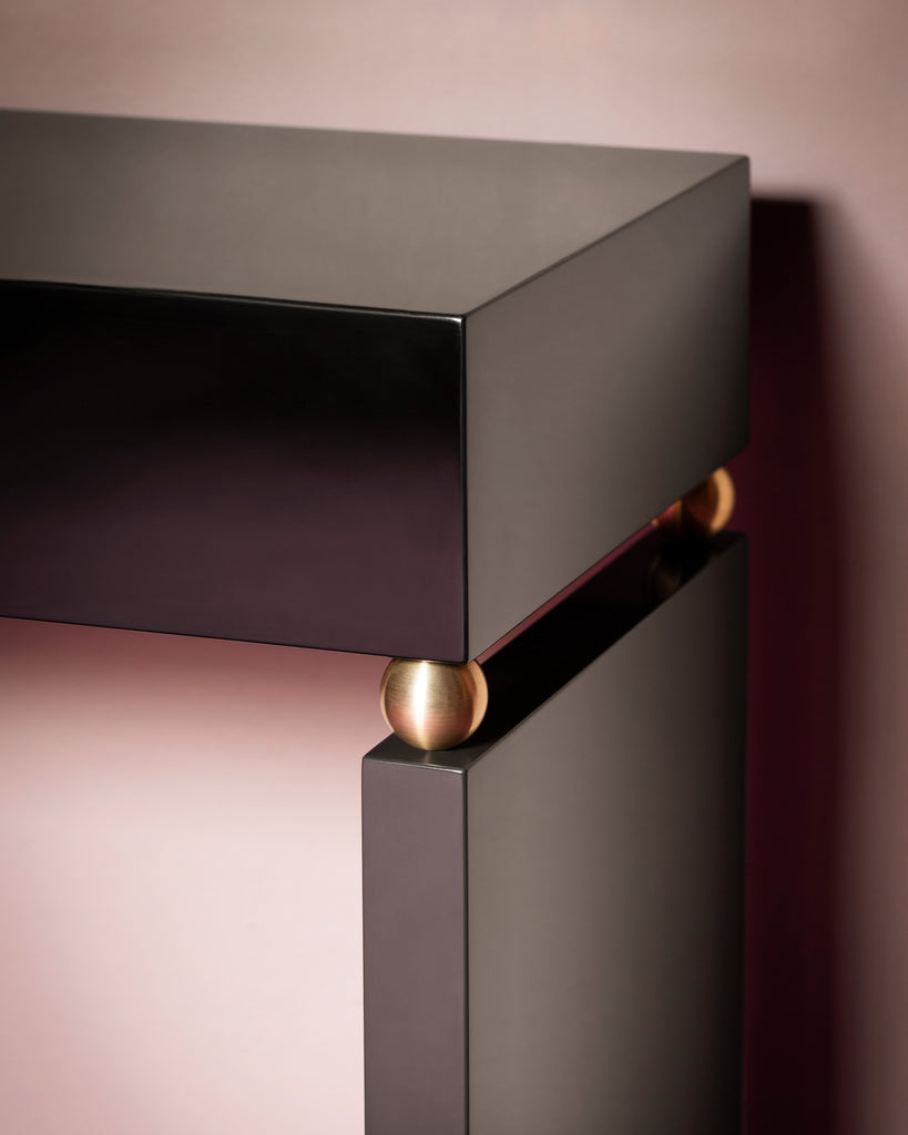 The Giuseppe Porcelli Consolle Table features a lacquered wood structure in deep black and green tones with uncoated brushed solid brass details. Polished and minimal, the piece reveals subtle contrasts between geometric precision and warm materiality.