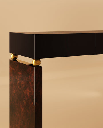 The Giuseppe Porcelli Consolle Table features a polished black lacquered wood top with rootwood legs and brushed brass accents. Its contrast of refined surface and natural grain reflects Porcelli’s fascination with duality and timeless Italian craft.