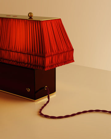 The Giuseppe Porcelli Table Lamp features a burgundy lacquered wood base with polished brass details and a pleated ruby silk lampshade. Elegant and tactile, it captures Porcelli’s refined balance of intimacy, craftsmanship, and decorative sophistication.