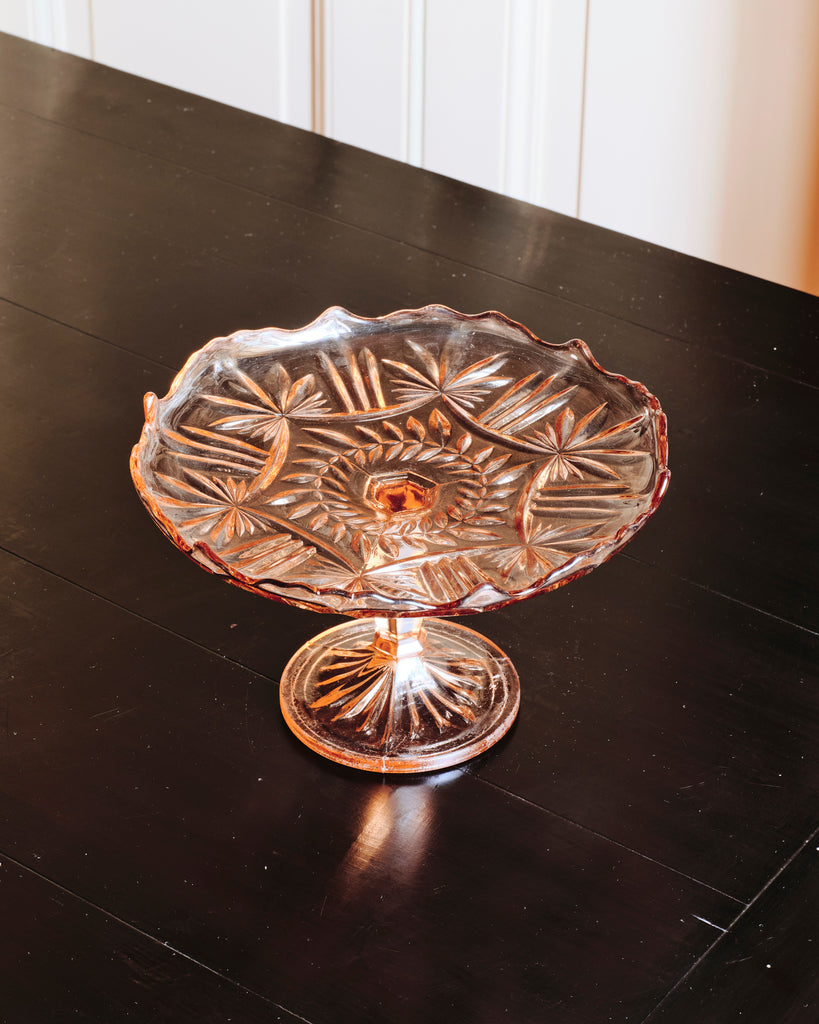 This warm amber glass cakestand glows with vintage charm. Its leaf-like detailing and soft golden hue lend a gentle sophistication, beautifully framing pastries or fruit with timeless grace.