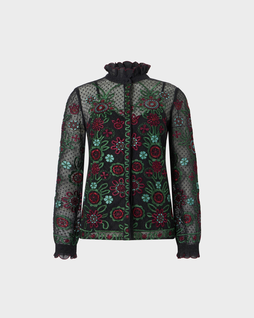 Delicate and textured, the Haga Blouse in deep black is crafted from cotton mesh with a subtle plumetis design. Bicolor floral embroidery and satin-thread detailing add depth and elegance, while crown-stitched cuffs and collar bring a refined, handcrafted touch.
