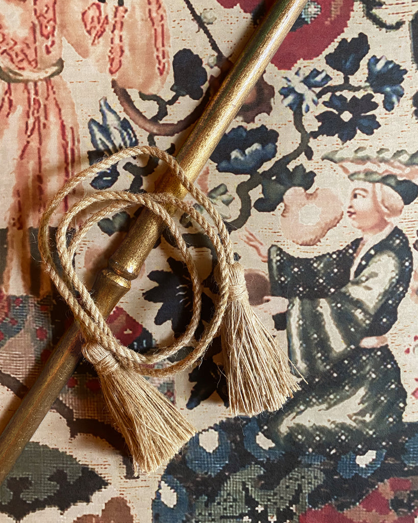 Drawing inspiration from 18th-century tapestries adorned with chinoiserie patterns, taking inspiration from a pair of side curtains created for a canopy bed. The fabric is supported by gold-painted faux bamboo sticks.