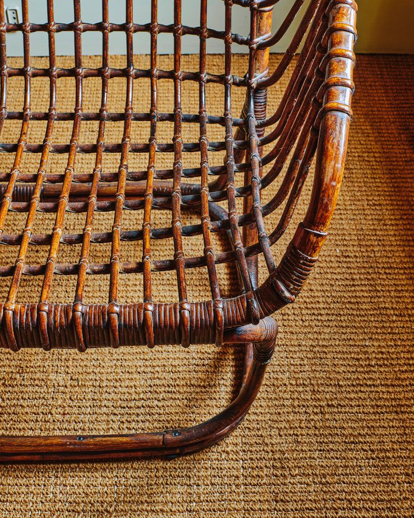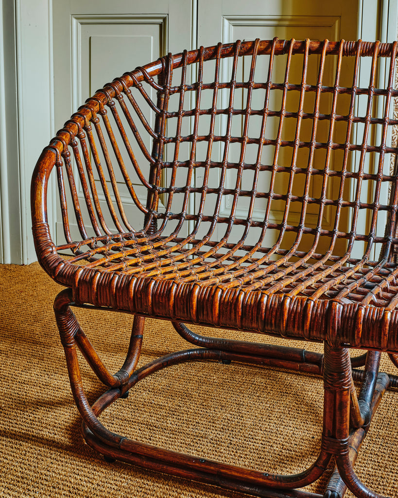 Designed by Italian architect Tito Agnoli, this rattan sofa is a standout piece of mid-century design. Its low profile and sweeping curves are crafted from finely coiled rattan, offering a relaxed yet sculptural addition to any space. Perfect for indoor or outdoor use.