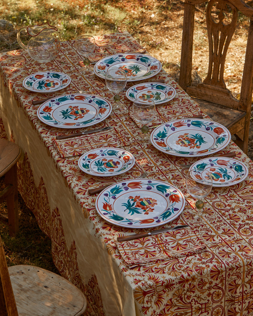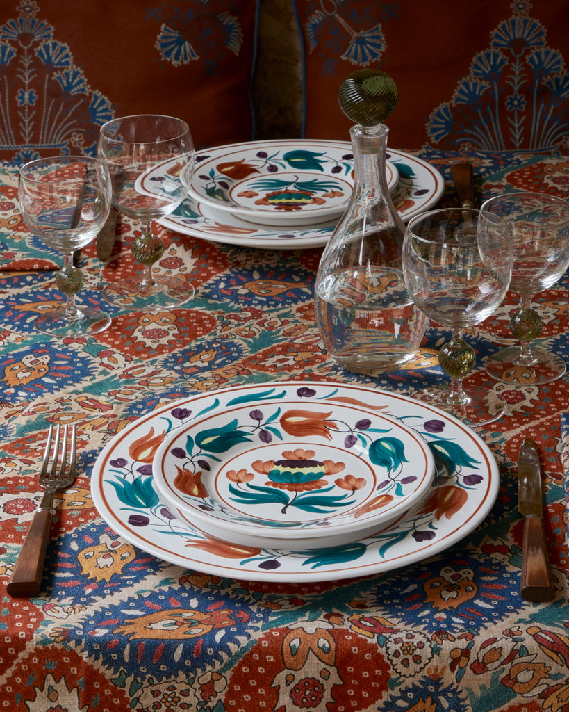 The Lia Dessert Plate is inspired by the traditional textiles, motifs and pottery found in the esteemed Benaki Museum of Greek Culture in Athens. Hand-painted by artisans in Umbria, it features a central motif framed by a border of florals.