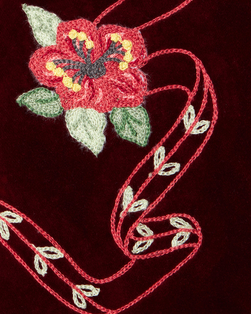 Part of an exclusive collaboration between Loretta Caponi and Cabana, the Hibiscus Gilet in bordeaux velvet reflects the meeting of two creative worlds: Caponi’s Florentine craftsmanship and Cabana’s passion for pattern and color. Loretta Caponi, renowned for her exquisite embroidery and timeless home and fashion pieces, brings artisanal detail to each design. The floral motifs were personally chosen by Martina Mondadori, adding her signature touch to the design.