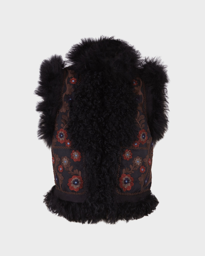 Rooted in traditional Afghan craftsmanship, the Magyar gilet embodies Antik Batik’s signature mix of heritage and contemporary ease. This sleeveless design in deep black features intricate floral embroidery that brings depth and texture to the piece. The tone-on-tone lambskin trim adds a refined touch, while the ultra-soft lining offers warmth and comfort.