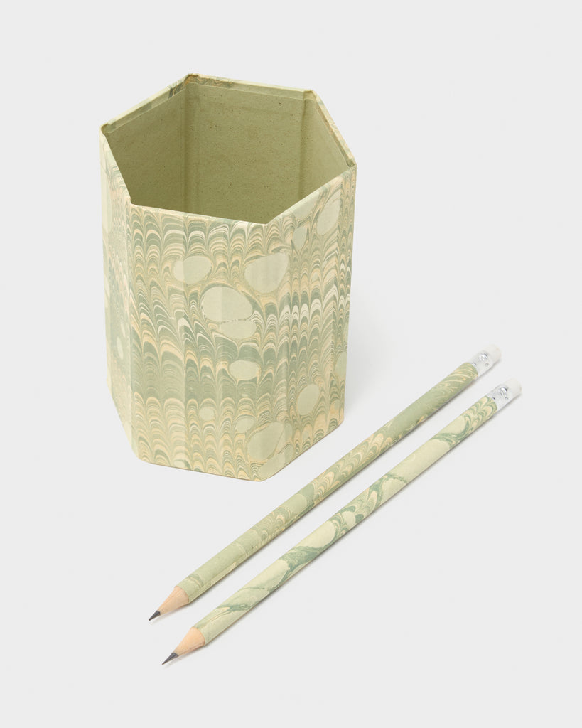 Marbling is an ancient technique from the Orient, which is known in history for its mastery of abstract decoration. The marbled pattern is created by combining pigments, oils and water in different quantities in a vat, which are then mixed carefully by the craftsman to create unique designs that can never be exactly recreated.