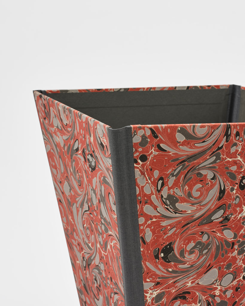 The Marbled Wastepaper Bin is handmade in Italy by Venetian artisans, wrapped in fine marbled paper—a technique steeped in history. The marbled pattern, created through the meticulous combination of pigments, oils, and water, renders each object a unique work of art, impossible to replicate. Available in four colors: yellow, green, light blue and orange.