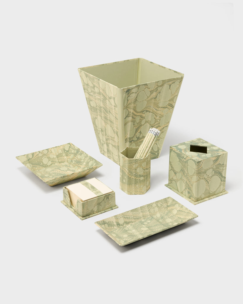 Marbling is an ancient technique from the Orient, which is known in history for its mastery of abstract decoration. The marbled pattern is created by combining pigments, oils and water in different quantities in a vat, which are then mixed carefully by the craftsman to create unique designs that can never be exactly recreated.
