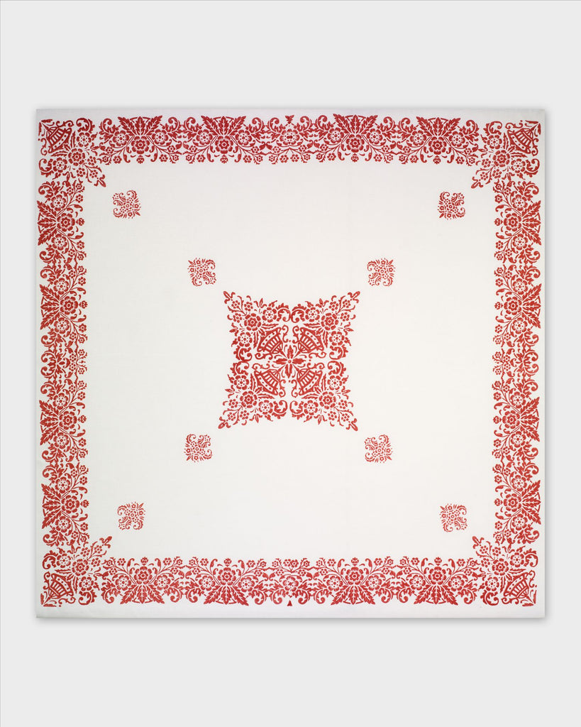 These unique tablecloths are printed by hand using wooden blocks, an ancient tradition kept alive in Italy by a small cadre of master artisans. Made in Emilia-Romagna, they feature a red motif of classic floral ornaments in two borders around a central cluster and stand as a testament to the quality of historic craftsmanship.