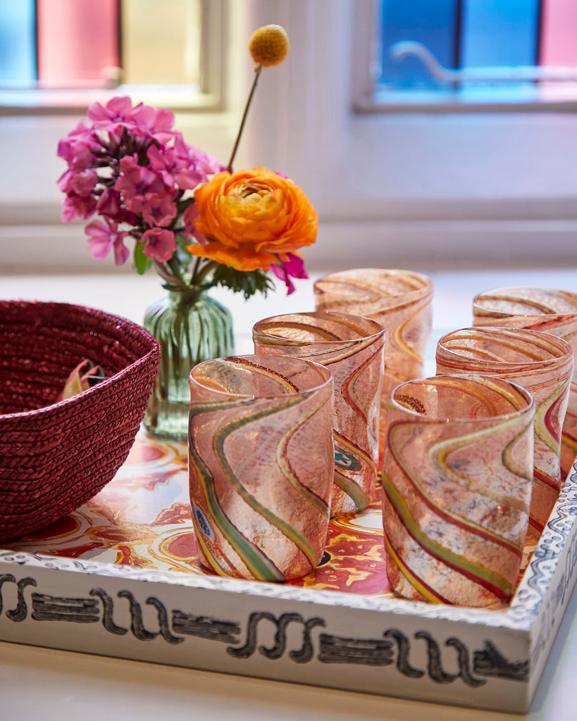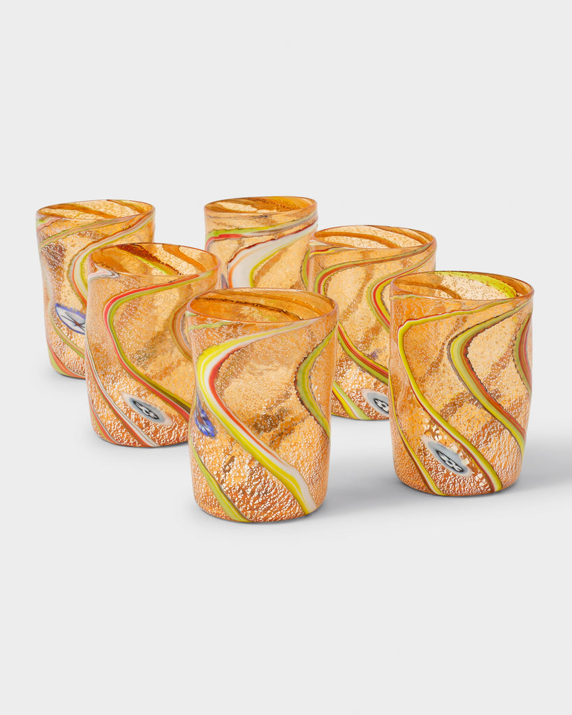 Crafted by hand on the Venetian island of Murano, where glassmakers have worked for centuries, the Pennellate glasses feature a swirling pattern of green, yellow, and red set over a smoky amber finish. They are further adorned with small fanciful designs in a variety of colors. Their eccentric spirit typifies the Cabana style, and we love placing them alongside our “Splatter” plates and “Rinascimento” textiles. Set of Six.