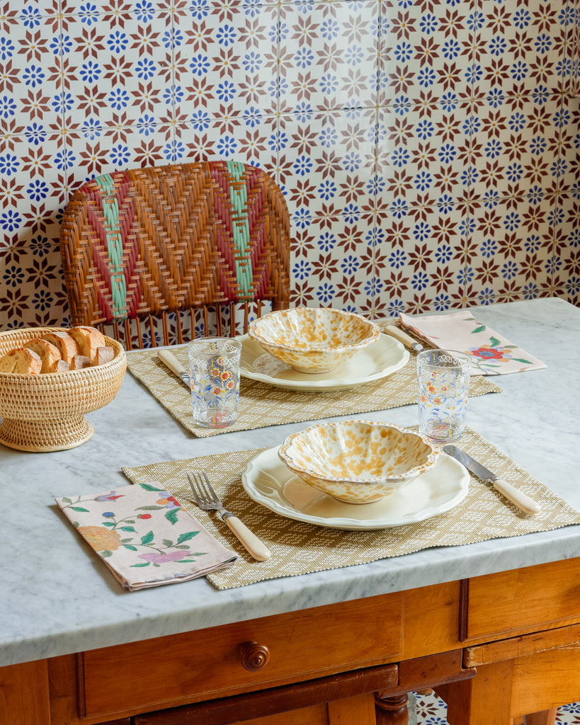 As part of our Silk Road Collection, we’ve partnered with talented Myanmar weavers and Palestinian glassblowers to produce these Rhombus woven placemats. These objects are heritage designs by the artisans, reflecting their historic traditions. This wonderful collaboration was made possible through our work with @turquoisemountain, a charity founded in 2006 by His Majesty King Charles III, that restores historic areas and helps to preserve traditional crafts.