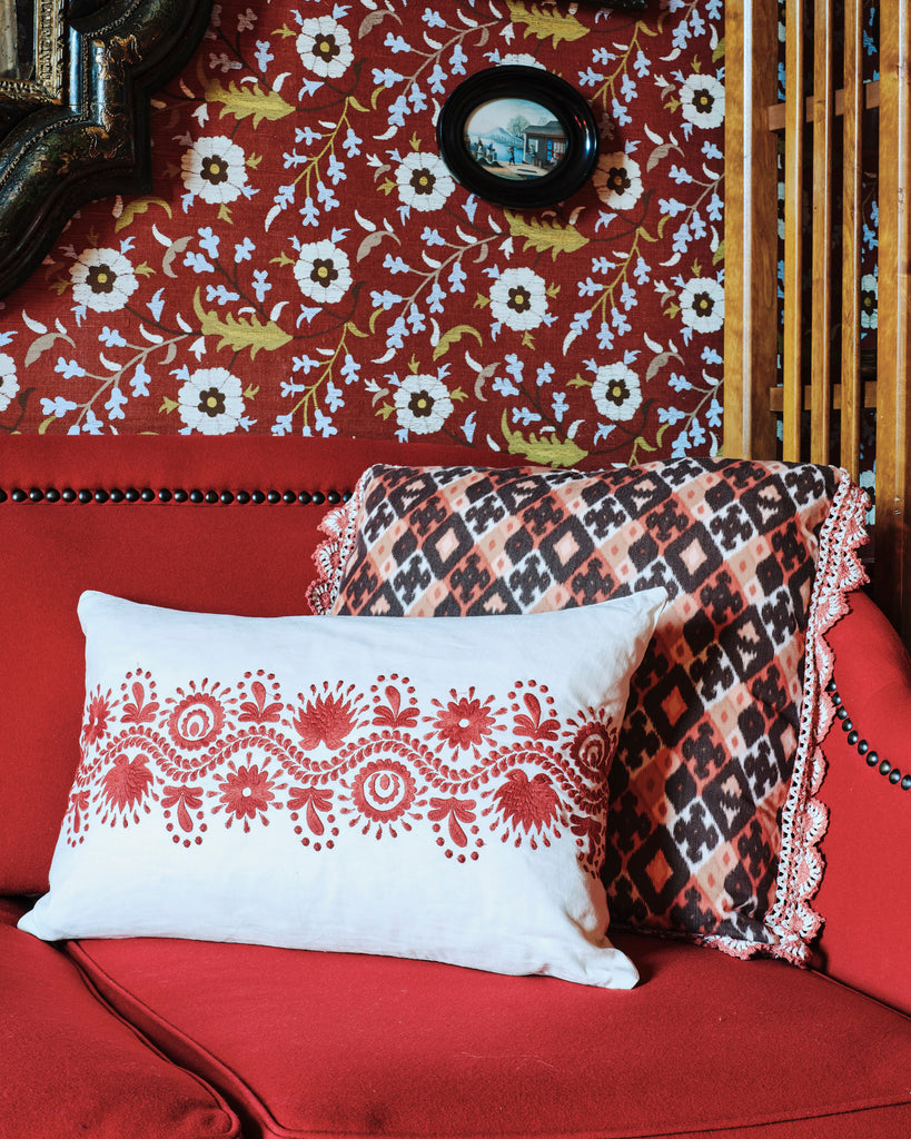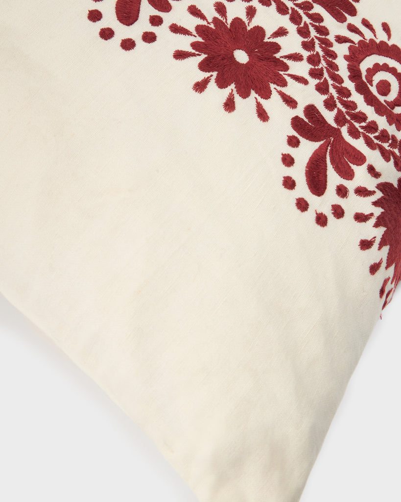 Schumacher x Cabana Theodora Embroidered Cushion, Red is made to order.