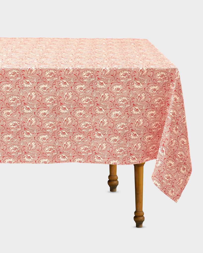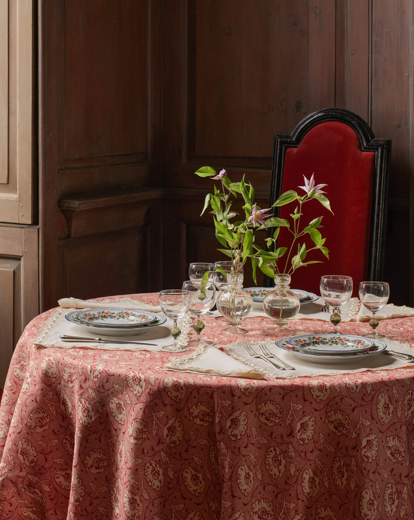 The Toscana tablecloth takes inspiration from a delicate 19th-century French textile. The tablecloth features a delicate yet simple motif of blooming flowers and elegant vines against a speckled background in hues of red and white. Matching napkins available.