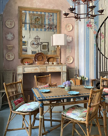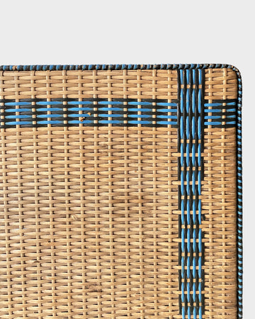 Vintage wicker and bamboo table with weaving details in blue and black. France, 1900s.