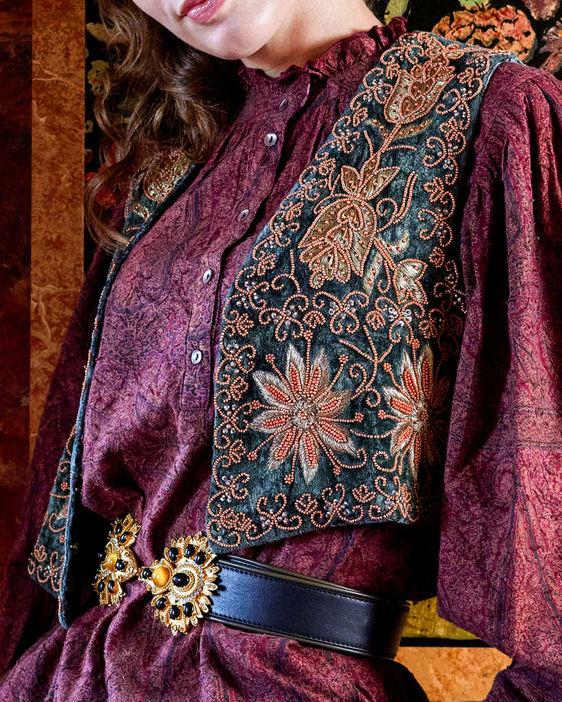 This collaboration between Antik Batik is a celebration of cultural heritage and artisanal excellence. The Zeni Gilet  embodies the timeless, bohemian spirits of Antik Batik and Cabana with its rich handcrafted details. Providing warmth and structure, this sleeveless vest showcases intricate floral embroidery in contrasting green, black and pink, creating a  folk-inspired look. The thick embroidered borders and vintage feel make it a versatile layering piece, perfect for adding a touch of artisanal elegance to flowing dresses or blouses. Ideal for cooler months, this striking gilet should be dry cleaned to preserve its beautifully detailed craftsmanship.